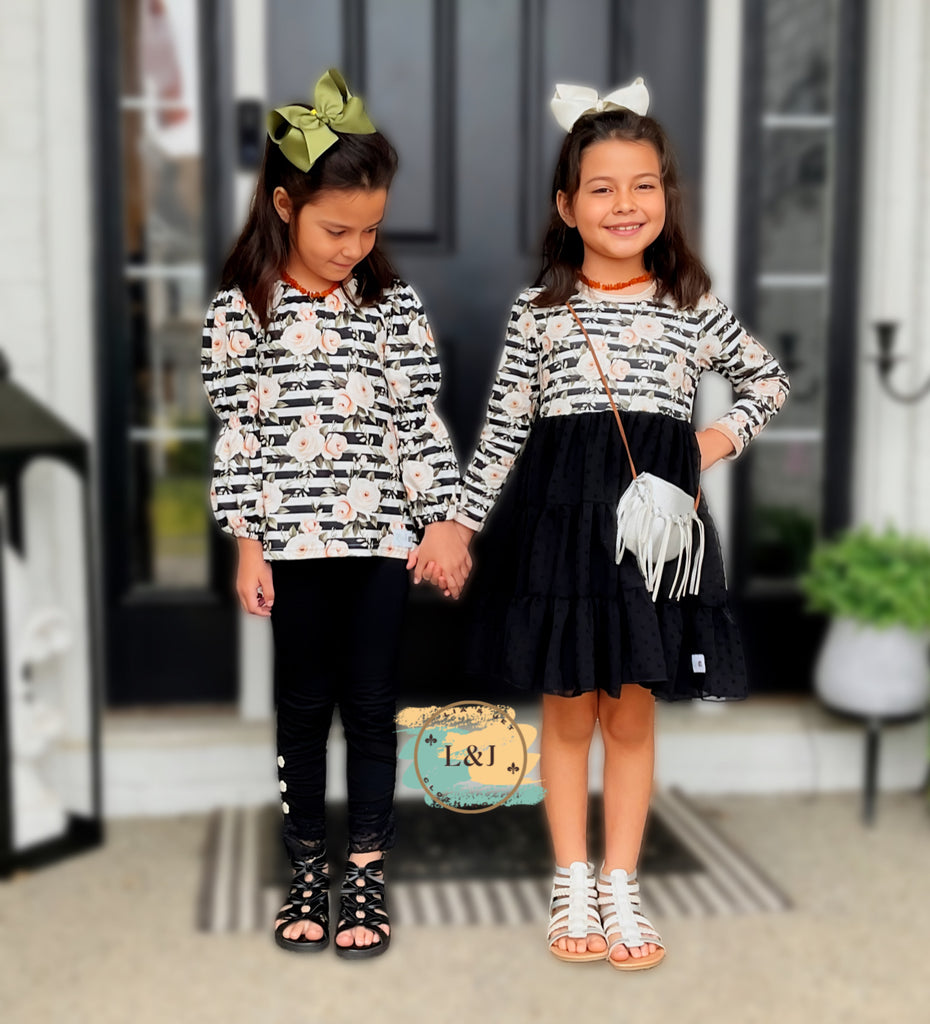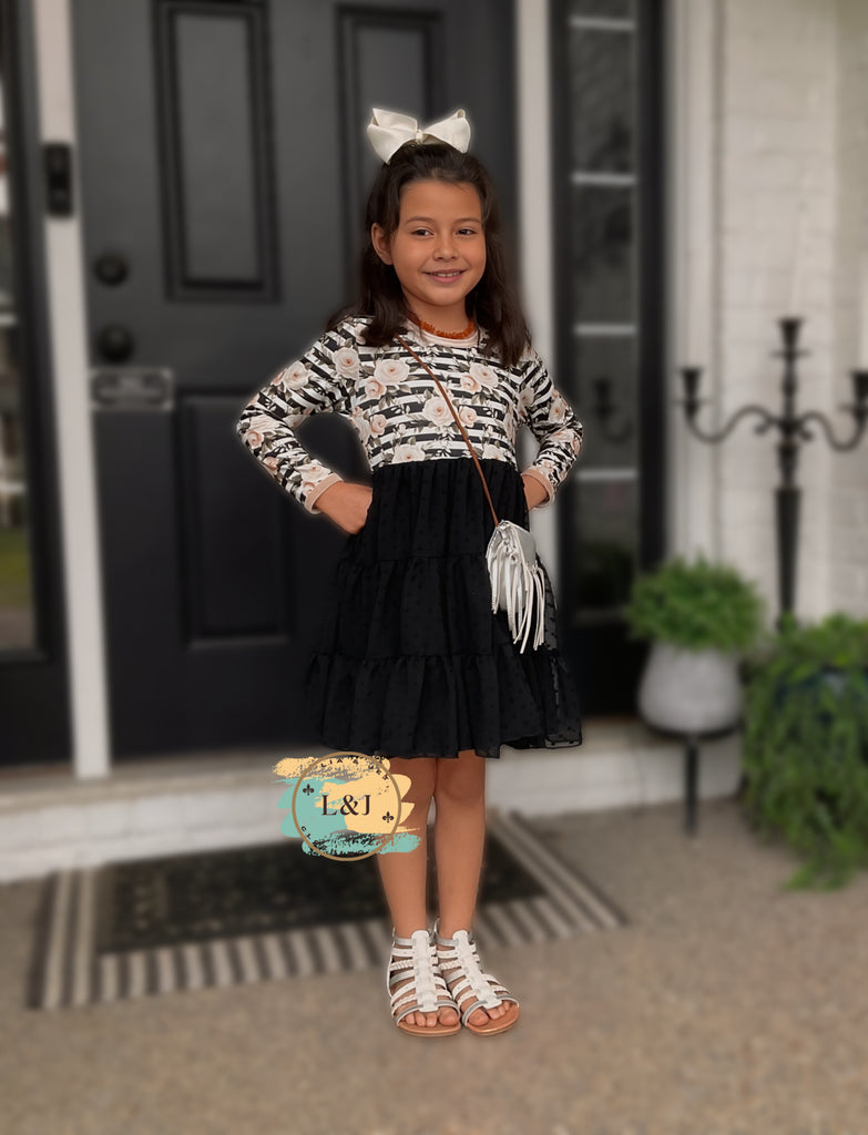 Get ready to turn heads in the Anna Midnight Garden dress! Made with soft brushed cotton and chiffon, this dress features a dreamy floral design in ivory and black. Perfect for adding a touch of whimsy to any occasion. Who says black and white can't be fun? (Hint: Not us!)