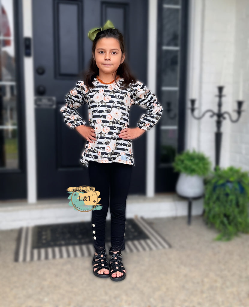 Introducing our Cora High/low top in Midnight Garden! This tunic features renaissance inspired sleeves and a cute floral design in ivory and black. It's the perfect match to our popular Ava leggings (sold separately). Add a touch of whimsy to your wardrobe with this unique top.
