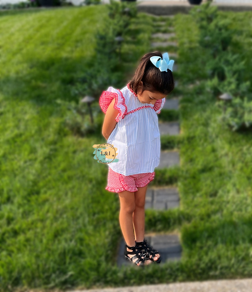 It’s a home run with our playful Lydia tunic! With blue stripes and red gingham, you'll be the star of all your summer celebrations. The triple flutter sleeves add a touch of whimsy while keeping you cool throughout the season.